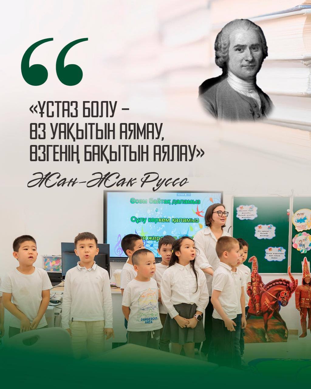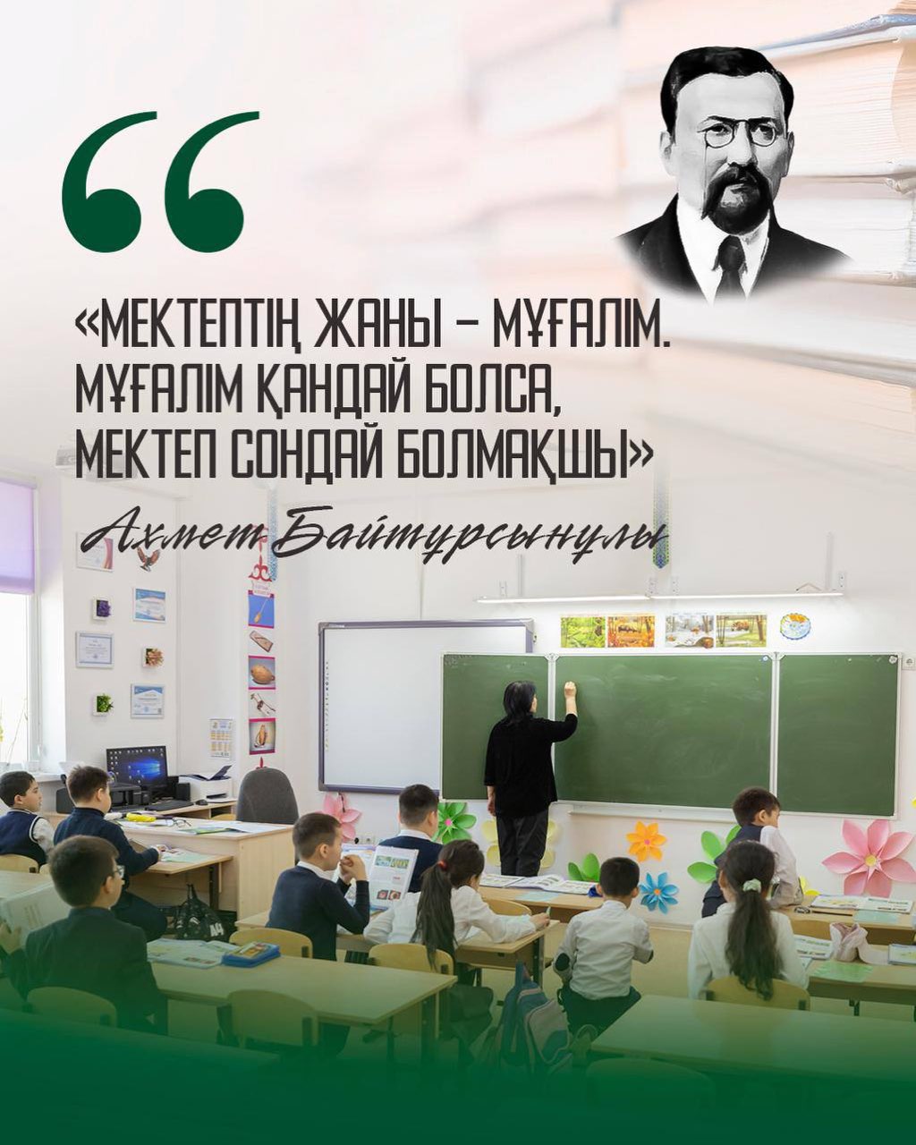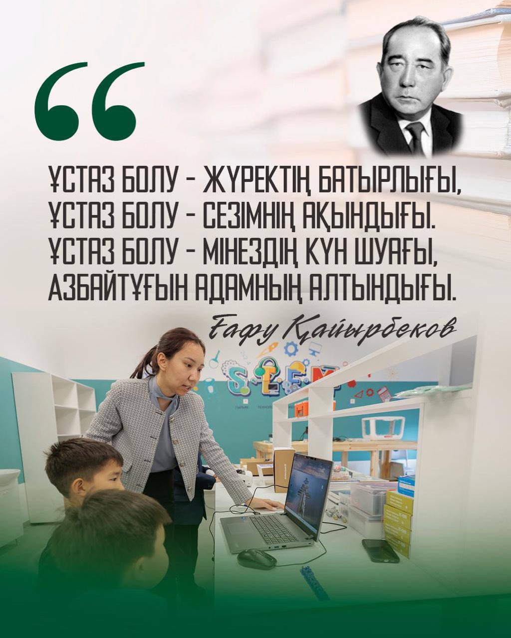 Мемлекет басшысы Қасым-Жомарт Тоқаев: «Мұғалімнің мәртебесі қашанда бәрінен биік. Ұлы тұлғалардың өзі ұстазының алдында шәкірт болып қала береді. Ұлттың болашағы – ұстаздың қолында. Менің мақсатым – ұстазды қоғамымыздың басты кейіпкері ретінде дәріптеу», - деп атап өтті.